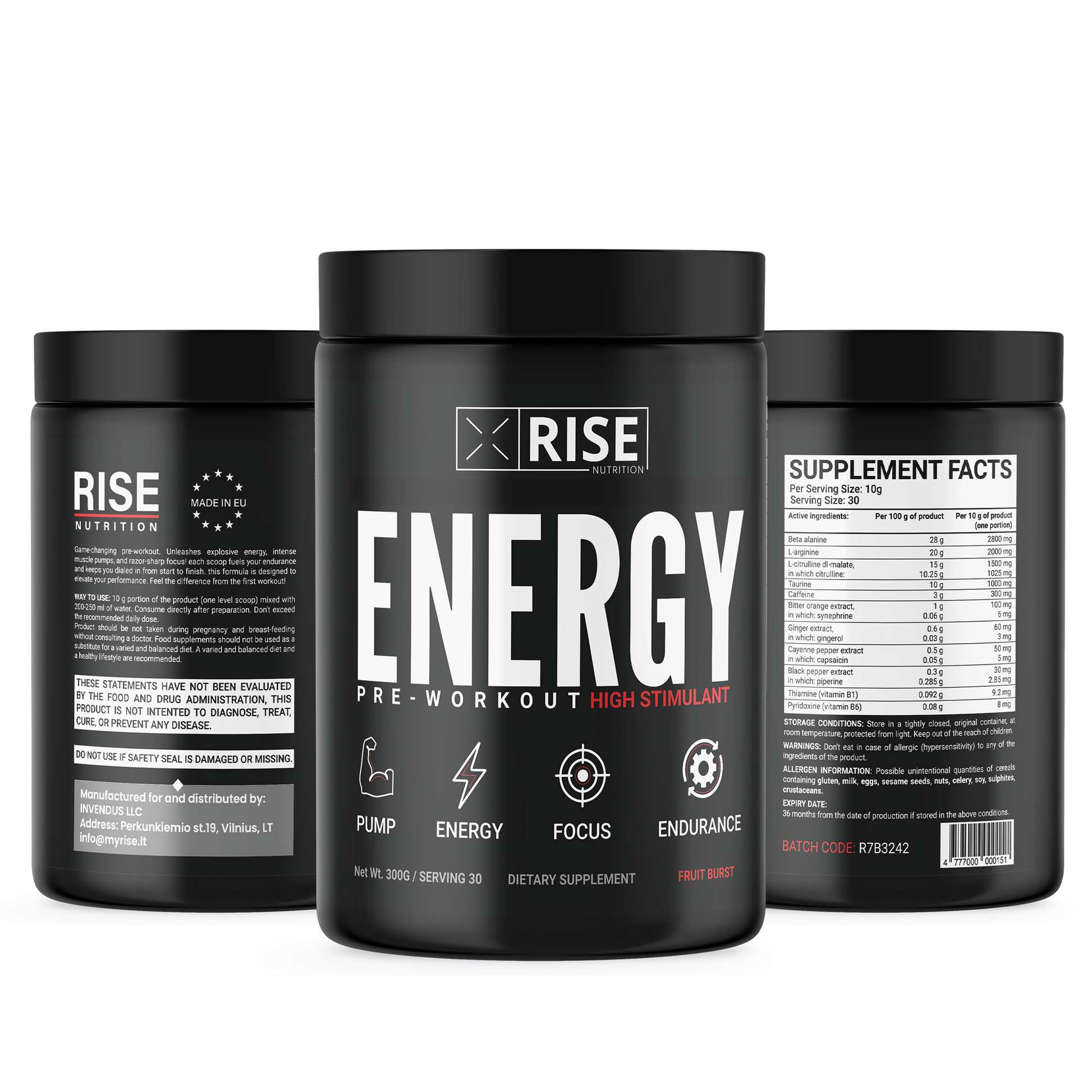 Rise Energy – Sudėtyje esantys ingredientai, tokie kaip kofeinas, taurinas, guarana, tiaminas ir vitaminas B6, padeda palaikyti nuolatinį energijos tiekimą ir susikaupimą treniruotės metu. Jo sudėtis pritaikyta aktyviems žmonėms, siekiantiems optimizuoti savo treniruočių patirtį. Nuostabaus vaisių skonio formulė užtikrina malonų vartojimą.