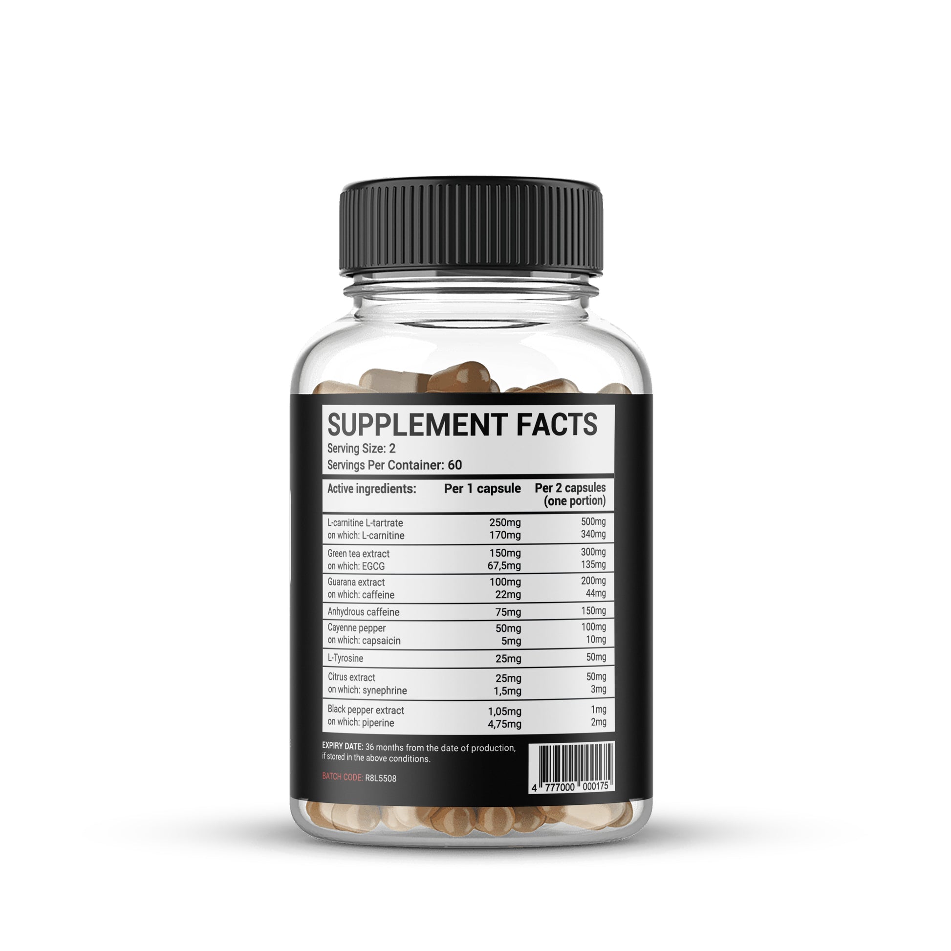 SUDEDAMOSIOS DALYS: L-karnitino L-tartratas, kininio arbatmedžio (Camellia sinensis) lapų ekstraktas, kuriame 45% (-)-epigalokatechin-3-galato, kapsulės apvalkalas želatina (iš galvijų), Gvaraninės paulinijos (Paullinia Cupana Kunth) sėklų ekstraktas, kuriame 22% kofeino, bevandenis kofeinas, kajeno pipirų (Capsicum annuum) vaisių ekstraktas, kuriame 10% kapsaicino, L-tirozinas, karčiavaisių citrinmedžių (Citrus aurantium) vaisių žievelių ekstraktas 20:1, kuriame 6% sinefrino, juodųjų pipirų (Piper nigrum) vaisių ekstraktas, kuriame 95% piperino, lipnumą reguliuojančios medžiagos (silicio dioksidas, riebalų rūgščių magnio druskos).